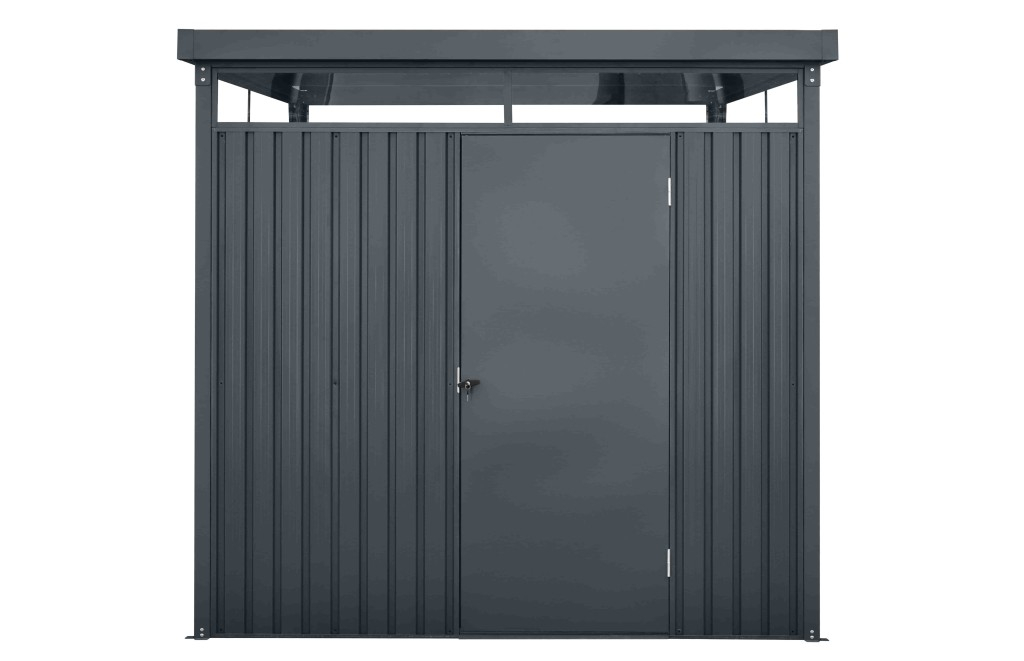 Ușa magaziei este prevăzută cu două balamale și vine cu două chei și un mâner rotativ pentru a asigura siguranța și accesibilitatea la uneltele și echipamentele de grădinărit. Ușa dispune de 3 prinderi și 4 cârlige, pentru o depozitare eficientă a uneltelor.